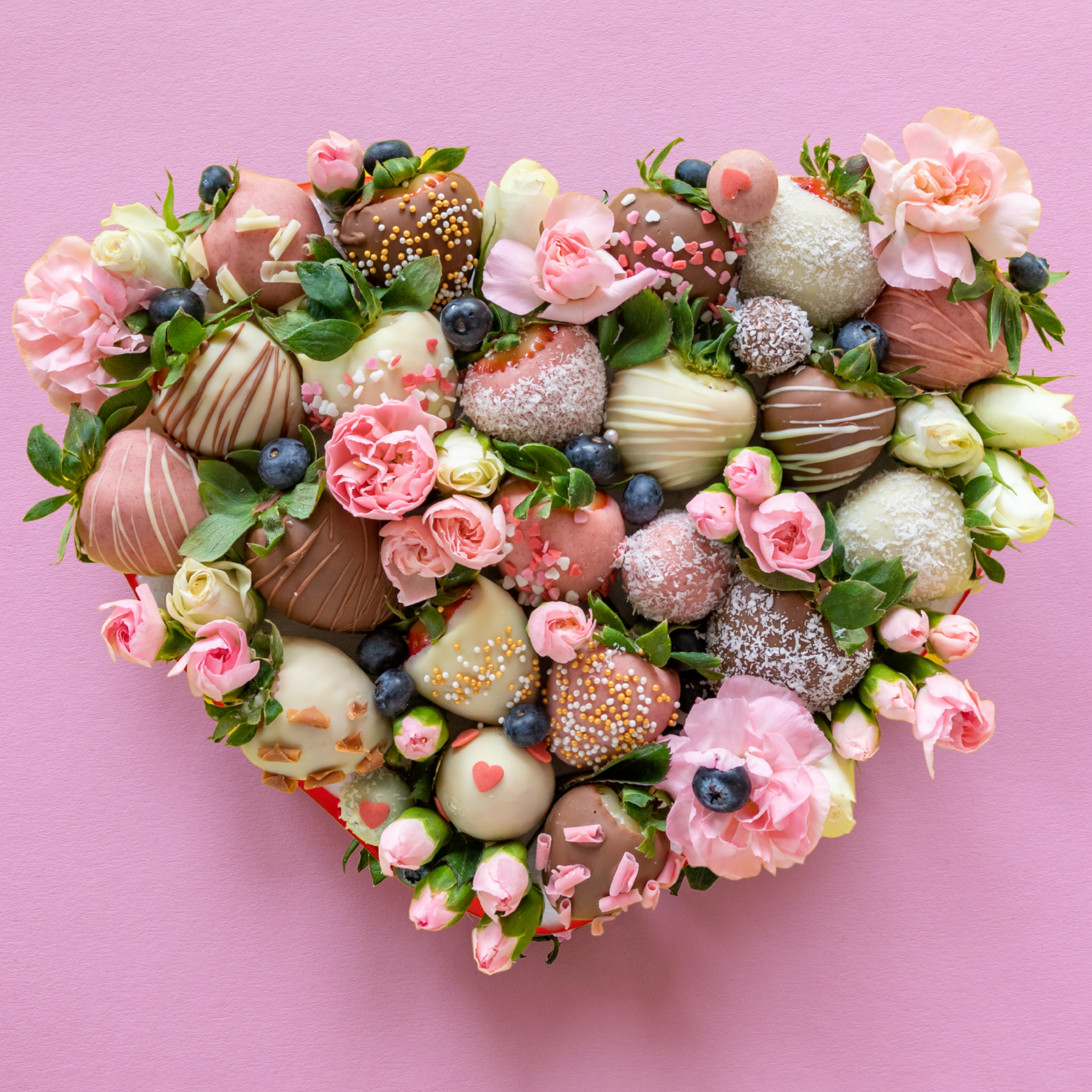 A heart-shaped arrangement of assorted decorated chocolates, surrounded by pink and white flowers and blueberries on a pink background.