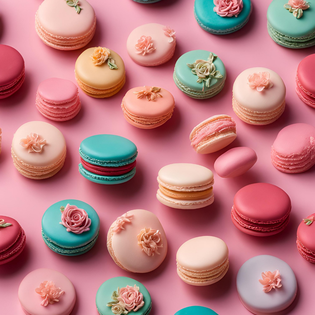 Colorful French macarons with floral decorations on a pink background.